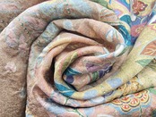 淡く落ち着いた緑・黄色・ピンク・茶色などの大胆な「染め分け」を施し、縁起の良い[吉祥文]の松や桜を配し、幻の花[辻ヶ花]が咲き乱れ、桔梗や杜若などの花々に仲睦まじい鴛鴦をあしらい、気品高く煌めく「金彩」を散りばめ「手絞り」をふんだんにあしらった、意匠美の素晴らしい作品です。
