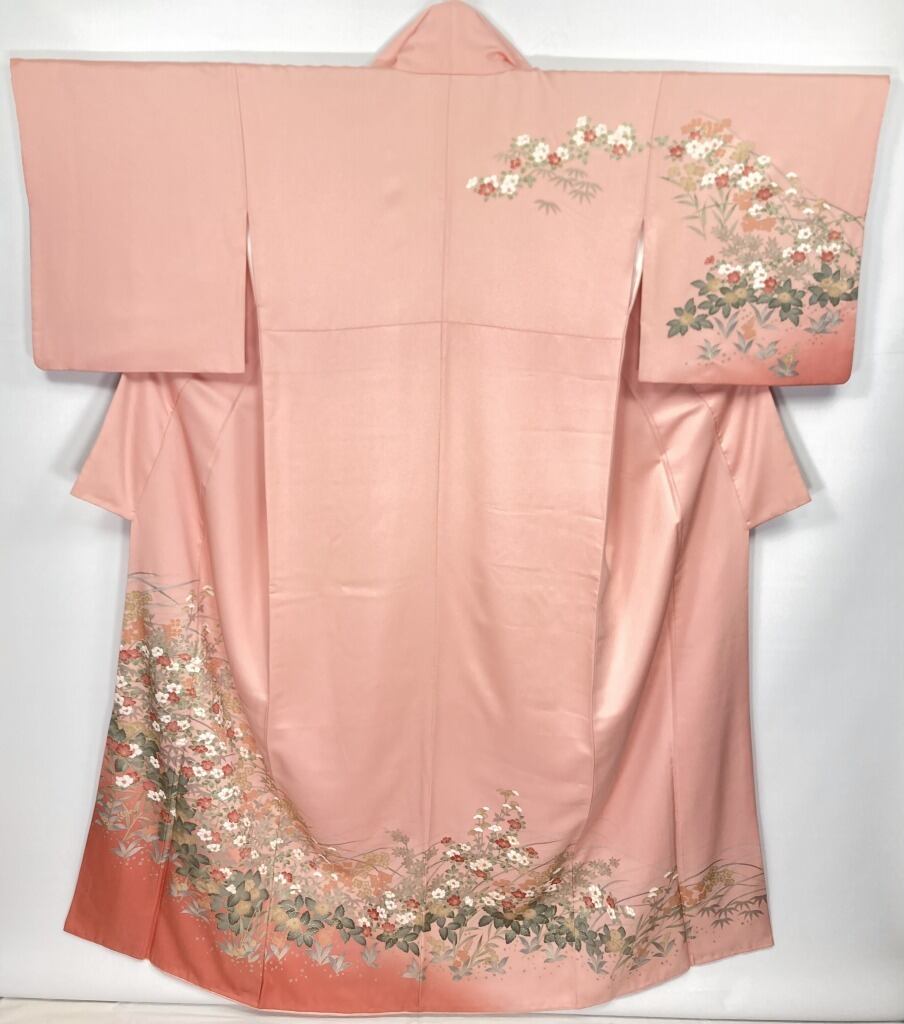 やわらかな「ぼかし染め」により濃いサーモンピンクへの美しいグラデーションによりメリハリが生まれ、椿や菊などの[四季の花々]が美しく咲き乱れ、「金彩」のきめ細かな縁取りをふんだ施した意匠美の作品です。