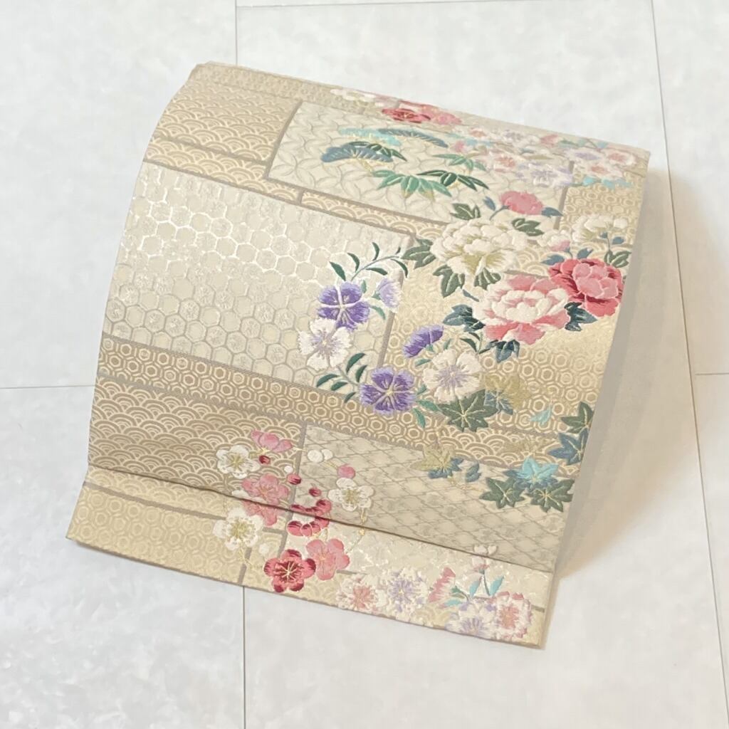 ■美しく輝く「金糸」「銀糸」を使い、格調高い[青海波][亀甲][松皮菱][七宝]を変り市松でモダンに配し、縁起の良い吉祥文の[松竹梅]や牡丹や桜などの[四季の花々]を間隔良く散りばめた、刺繍のようなふっくらとした「唐織り」できめ細かく丹念に織り出した大変加工の良いお品です。