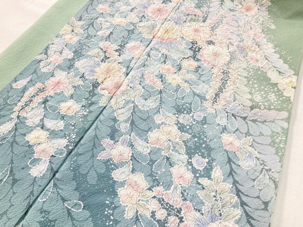 深い青緑への大胆な「染め分け」を配し、ワントーン暗い色合いへのグラデーションによりメリハリが生まれ、多彩な「友禅」「ぼかし染め」「墨絵書き」「手絞り」を駆使し、上前の上部より[辻ヶ花]が華麗に枝垂れた、意匠美の大変素晴らしい作品です。
