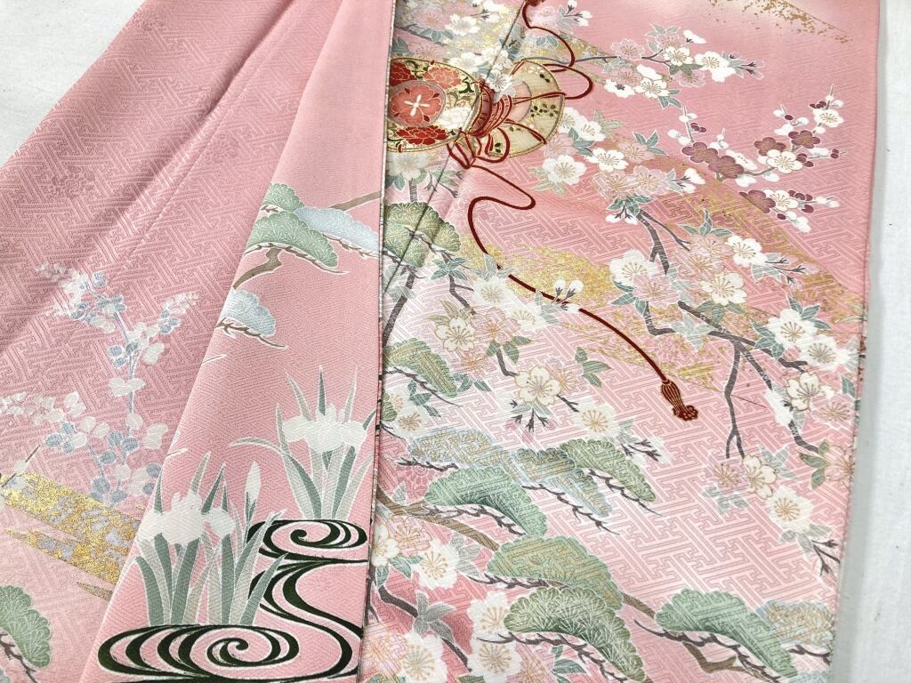 京友禅 金駒刺繍 花柄 鼓 扇 訪問着 袷 正絹 似桃色 ピンク 1296