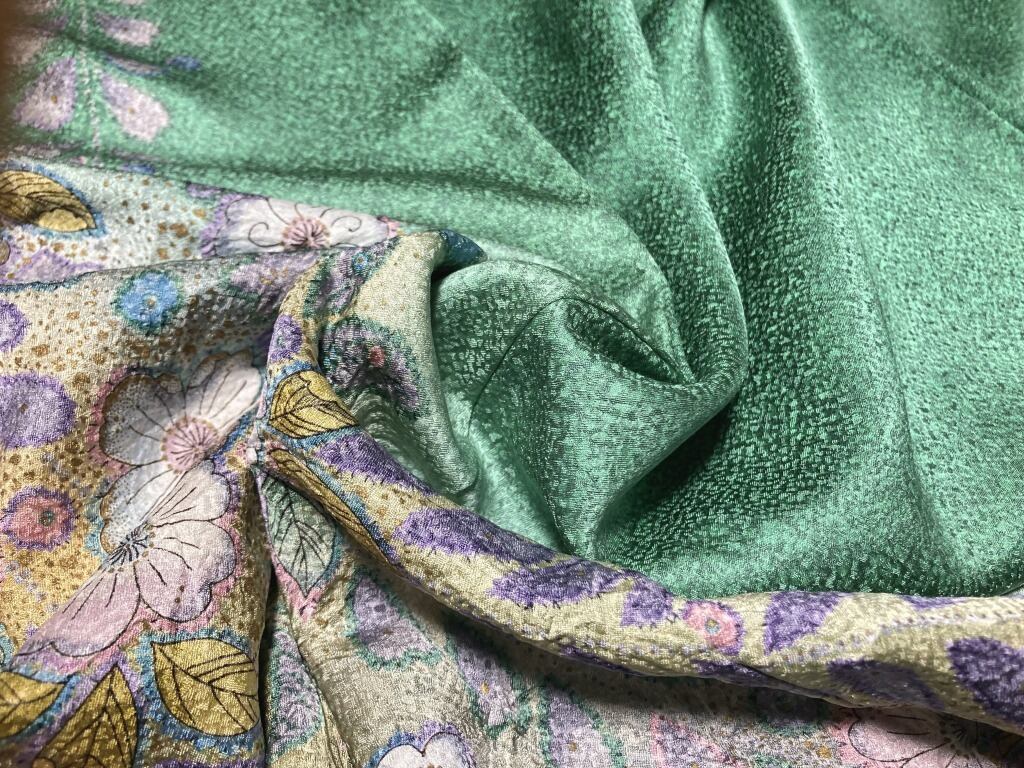 カワセミの羽色のような鮮やかな緑の「翠色」すいしょく (伝統色のいろは) を明るくしたような、とても素敵な地色です。